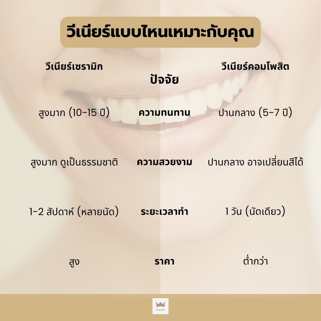 เลือกวีเนียร์เซรามิก... หากคุณต้องการผลลัพธ์ที่สวยงามสมบูรณ์แบบที่สุด มีงบประมาณเพียงพอ และต้องการวีเนียร์ที่มีความทนทานสูง ใช้งานได้ยาวนาน